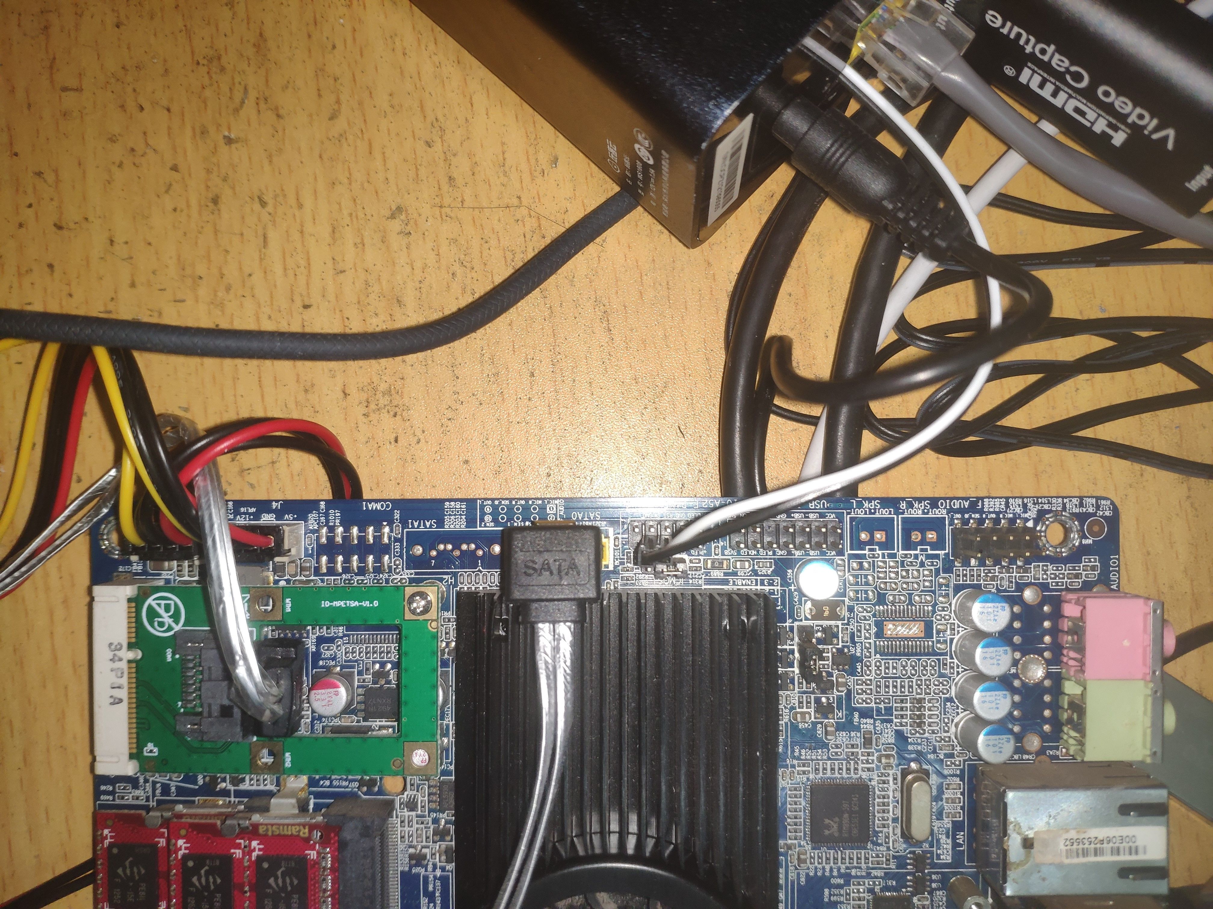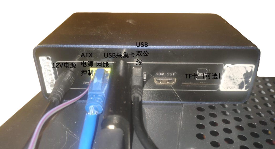 Insert the USB HDMI capture card into the USB port near the Ethernet jack. Connect HDMI to the capture card, and the dual-headed USB cable to the USB port next to HDMI. Plug in Ethernet and power.