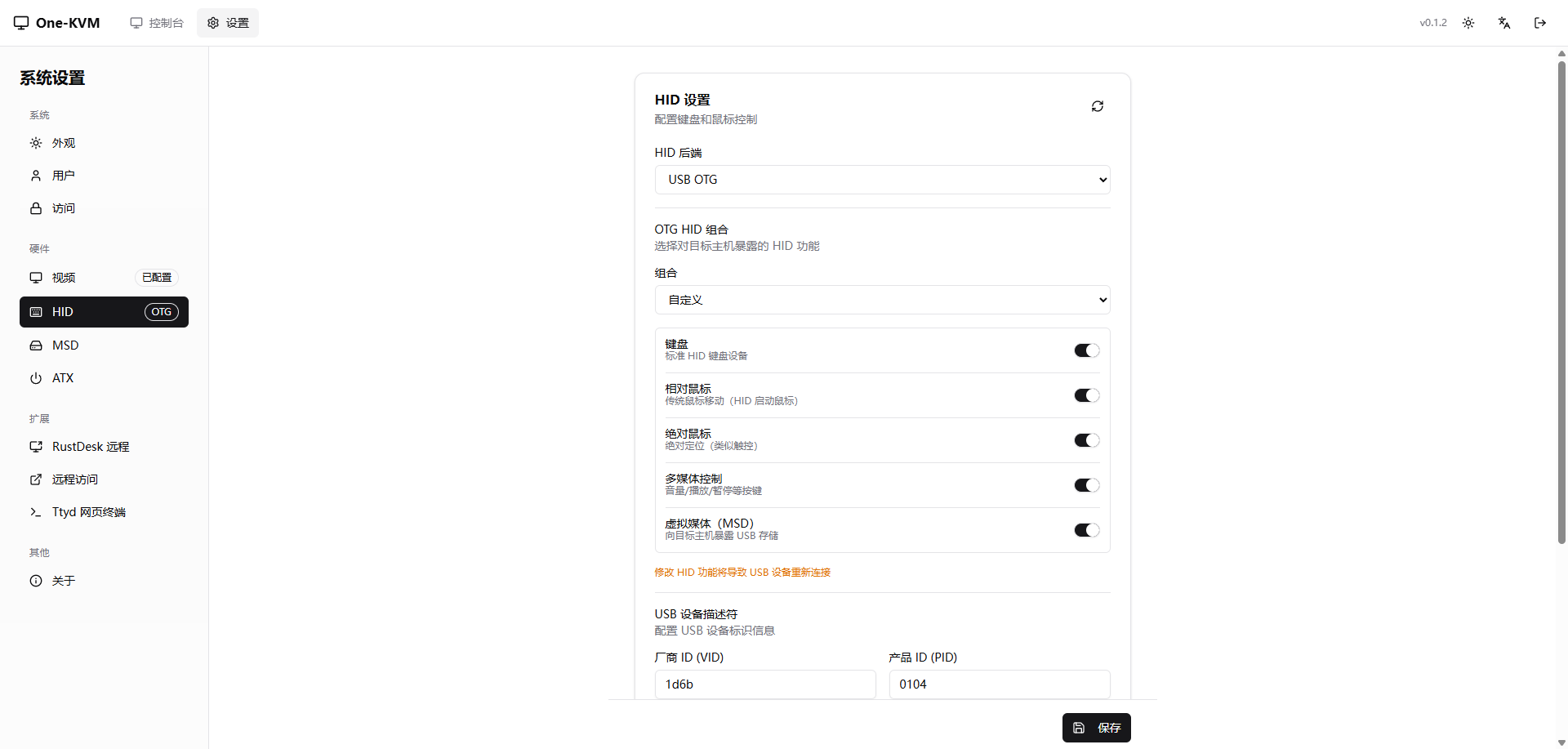- 自定义 HID 功能:键盘 / 相对鼠标 / 绝对鼠标 / 多媒体