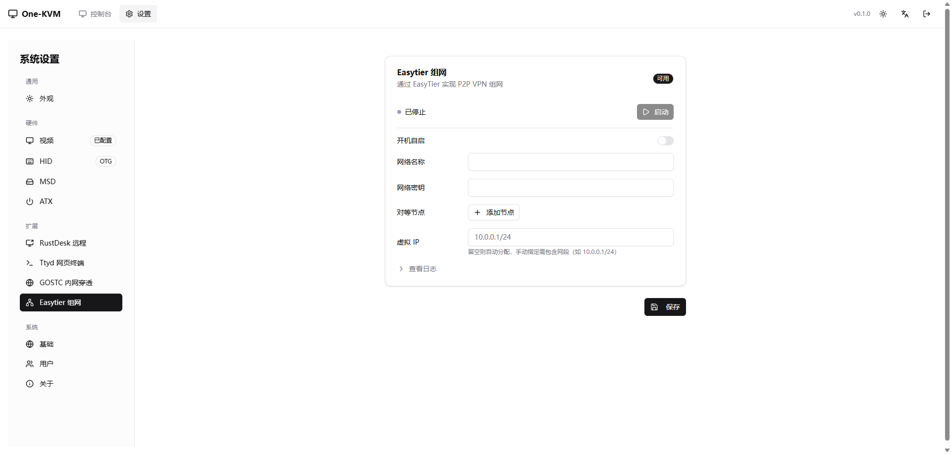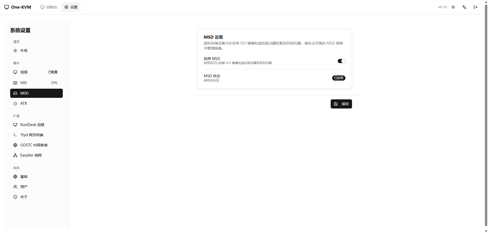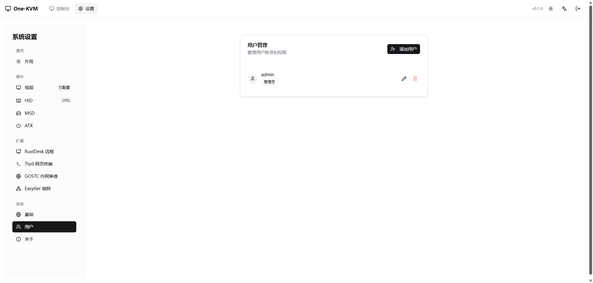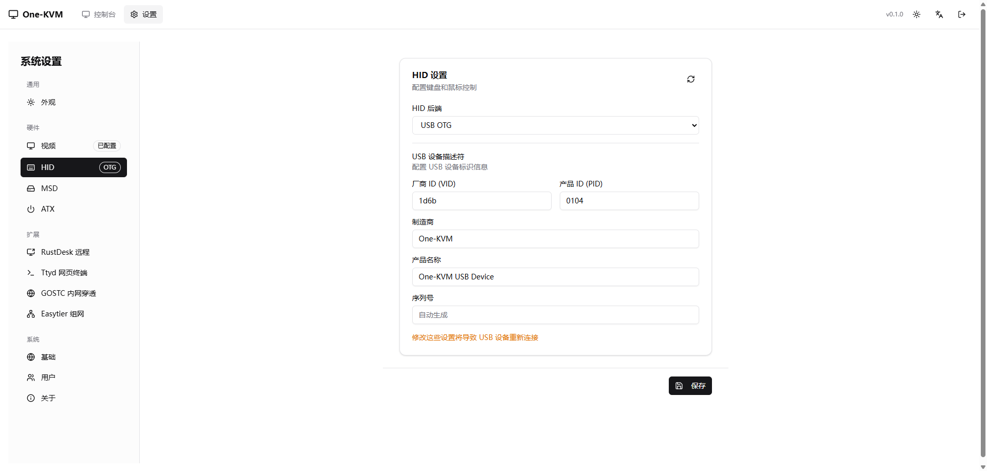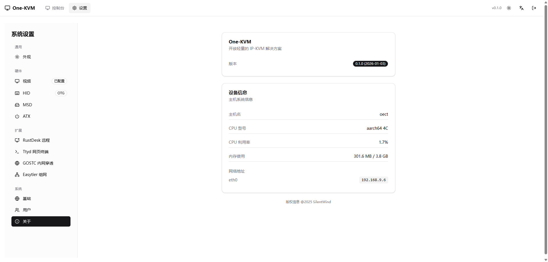 设置页面¶ 设置页面允许您配置 One-KVM 的各项功能。 访问设置¶ 点击界面右上角的齿轮图标 进入设置页面。 通用¶ 外观¶ 硬件¶ 视频设置¶ HID 设置¶ MSD¶ ATX 设置¶ 扩展¶ RustDesk 远程¶ Ttyd 网页终端¶ GOSTC 内网穿透¶ Easytier 组网¶ 系统¶ 基础¶ 用户¶ 关于¶