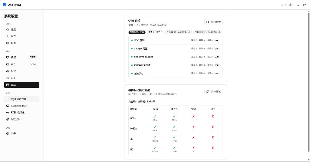 运行诊断工具,检查 USB OTG / gadget 链路与硬件视频编码能力。