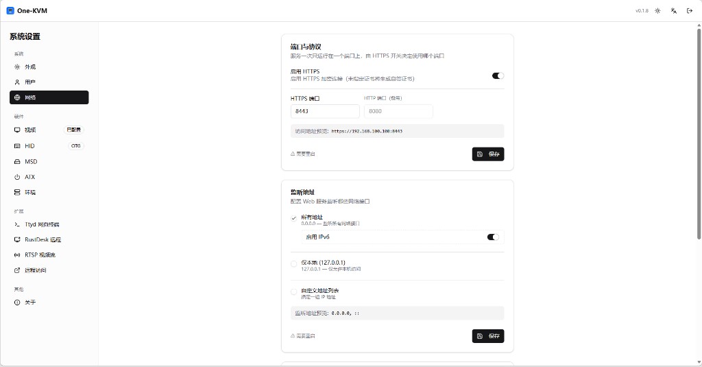设置页面允许您配置 One-KVM 的各项功能。
