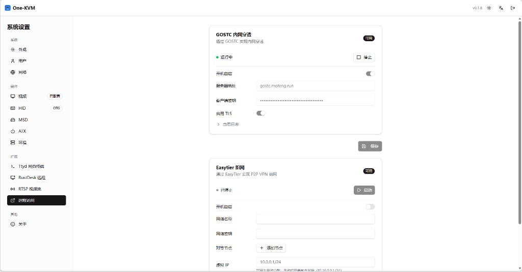 可在此页面配置 GOSTC 内网穿透与 EasyTier P2P 异地组网。