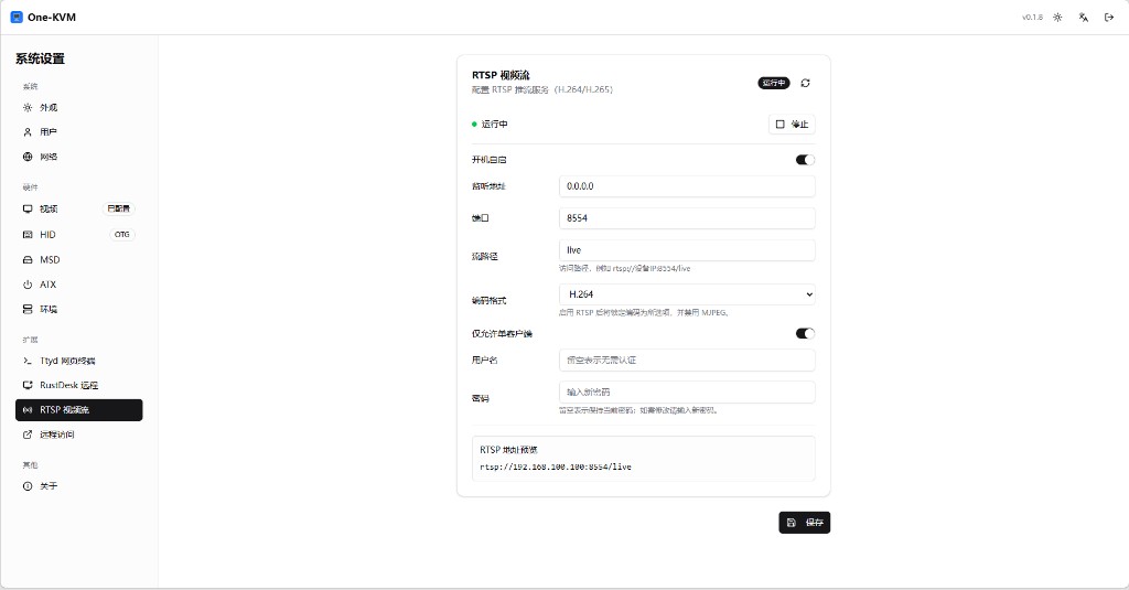 将当前视频以 RTSP 推出,可设置监听地址、端口、路径、编码格式与访问认证。