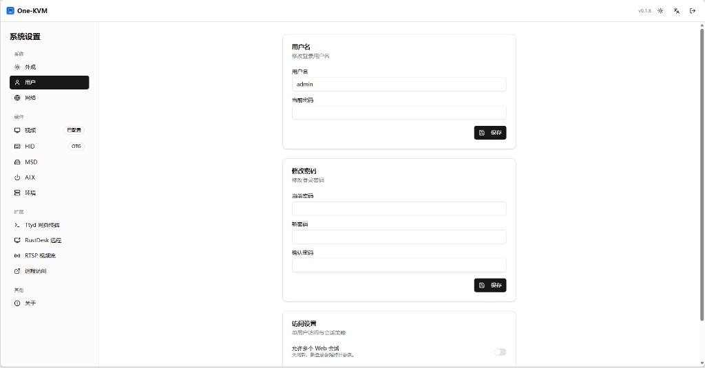 管理登录用户名与密码,以及是否允许多个 Web 会话同时在线(关闭后新登录会断开已有会话)。